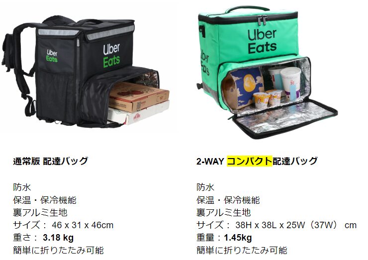 保冷バッグは2種類で、配達パートナーの登録をすると、Uber Eats の公式サイトで購入できます。