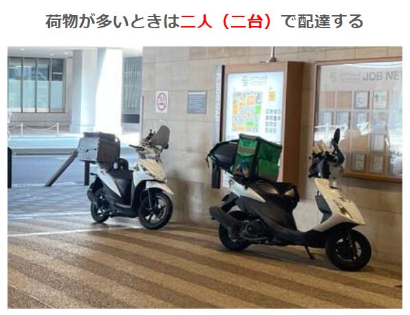 通常~多めの荷物は一人で、相当荷物が多い場合は二人で協力して配達します。
