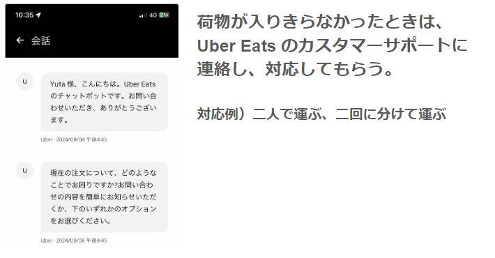 ですから、カスタマーサポートに連絡し「荷物が多すぎるから、もう一人、配達パートナーを呼んでほしい」と伝えればOKです。