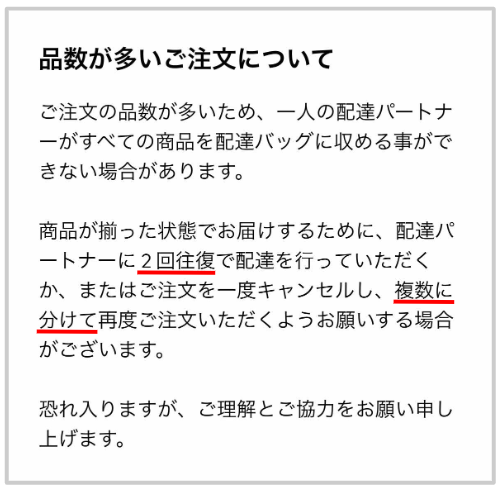 このような理由のため、品数が多すぎても商品が入りきれず配達できないことはありません。