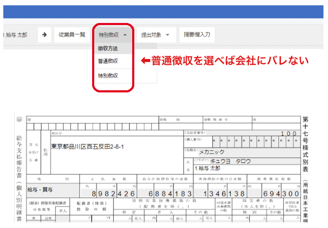 特別徴収と普通徴収のやり方はかんたんです。ボタン一つで特別徴収と普通徴収の変更ができます。確定申告の季節(2~3月)になってから考えればいいことです。