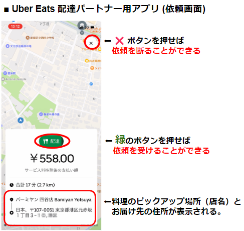 Uber Eats では、配達の依頼が来た時に、どのお店の料理を、どこに届けるかがわかります。