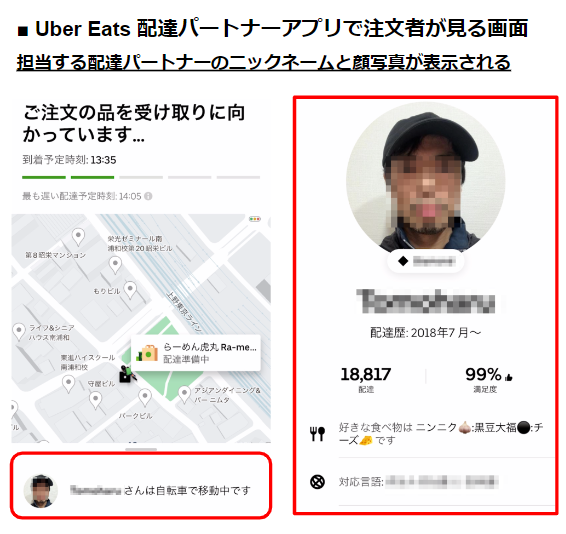 Uber Eats では配達を依頼した注文者に、配達パートナーの顔写真と名前が知らされます。